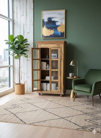 Mango Wood Bookshelf with 4 Glass Doors & Storage — 200 x 180 x 40 cm A spacious mango wood bookshelf featuring four glass doors and additional storage compartments below. Elegant and functional, ideal for displaying books and organizing essentials.