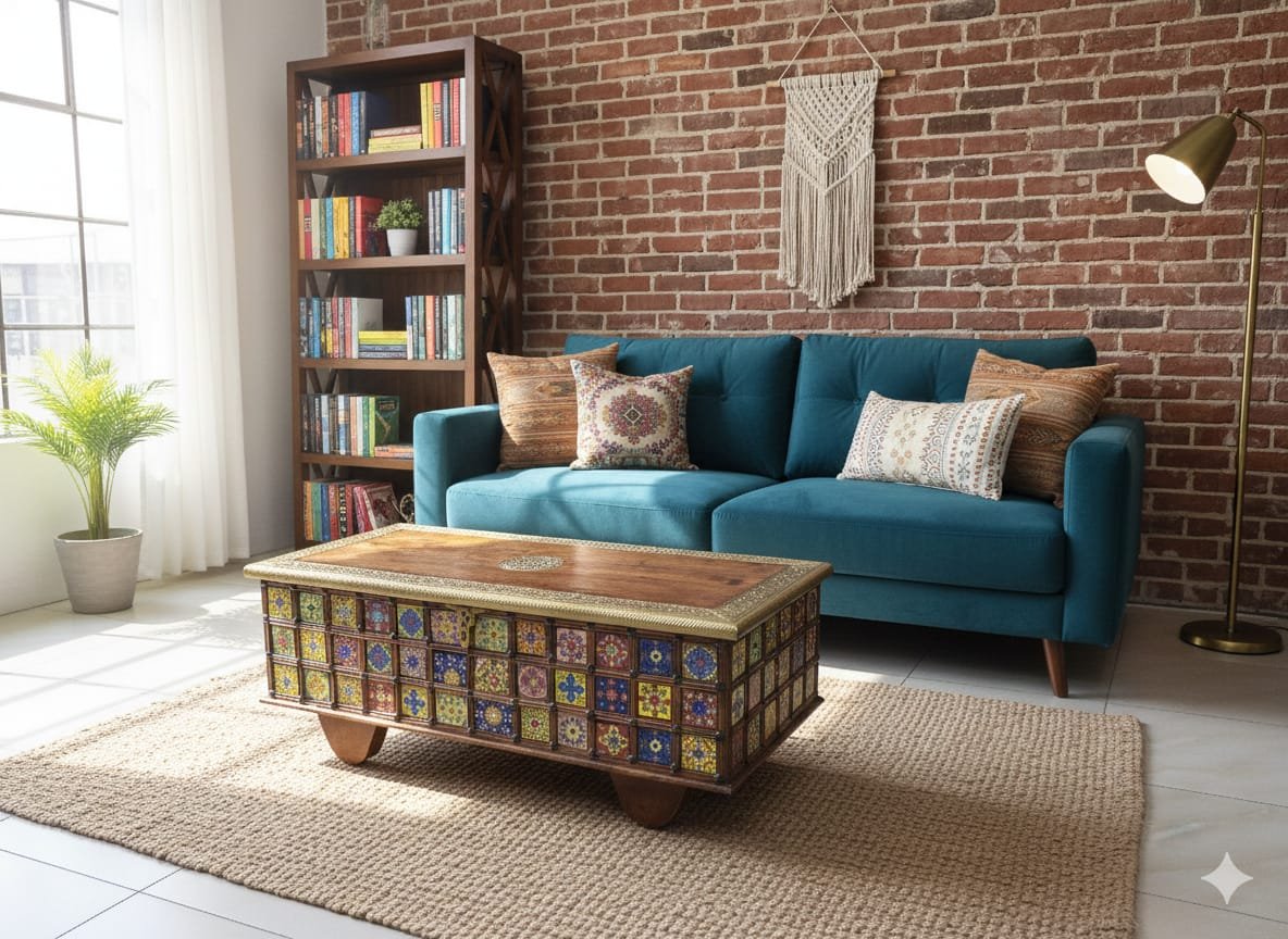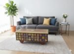 #Sandhook #WoodenChest #TrunkStorage #HandPaintedFurniture #IndianHandicrafts #TrolleyTable #StatementPiece #HandmadeHome #WoodAndBrass #TileArt