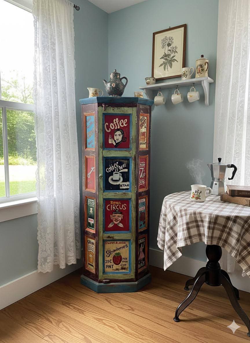 Beautiful and colorful hand-painted corner cabinet that adds instant charm to any room! Each panel is decorated with a fun, vintage-style design — perfect for a cozy kitchen, café corner, or reading nook.