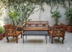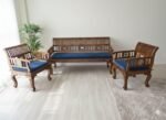 Elevate your living room with the timeless beauty of Indian heritage. This exquisite 5-seater sofa set (3-seater bench + two single armchairs) is masterfully crafted from premium Indian Sheesham wood, known for its exceptional durability and rich, natural grain patterns.