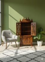 Standing at a significant 180cm height, this piece balances presence with practical design. The upper sanctum is secured by beautiful jali-cut (lattice) doors featuring carved “Om” motifs, allowing for a glimpse of the deity within while maintaining an air of sacred mystery. The lower portion provides substantial storage, making it a complete solution for your spiritual needs.