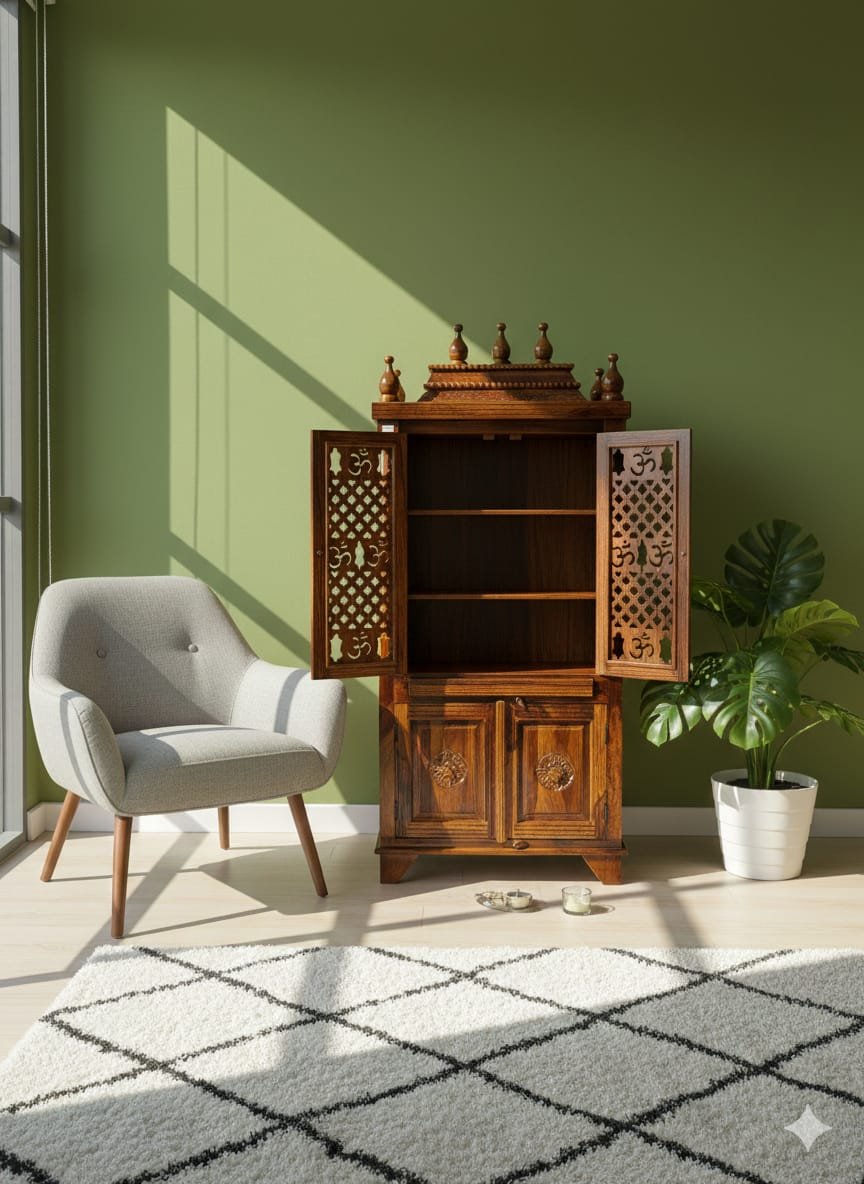 Artisanal Details: * Dual lattice-work doors with traditional “Om” carvings for ventilation and aesthetics.