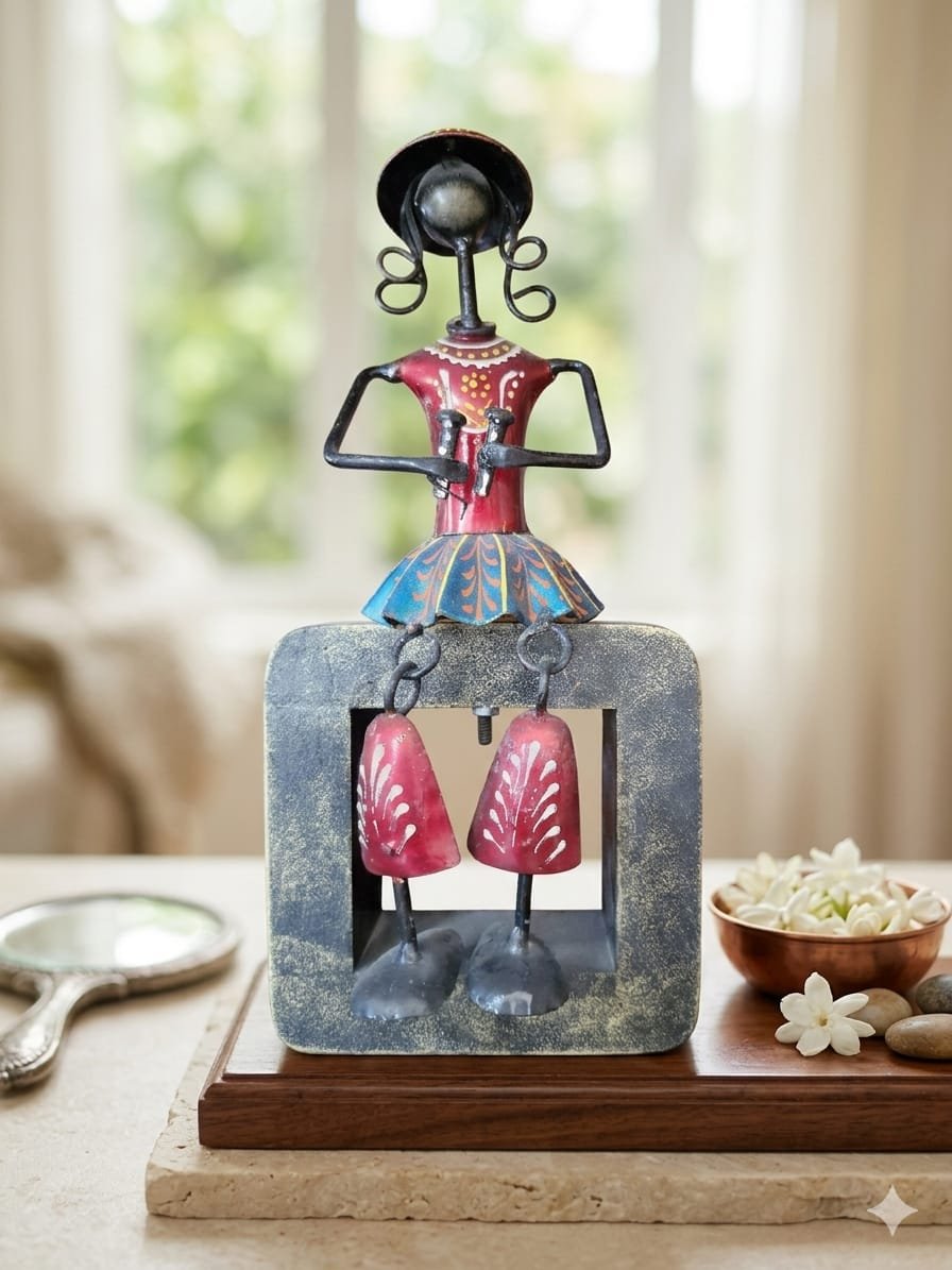 Add a touch of playful elegance and artisanal soul to your home with this unique Handcrafted Metal Sitting Lady. Perfectly balanced on a rustic square frame, this figurine is a celebration of traditional metal craft reimagined for the modern, creative space. With her vibrant hand-painted attire and charming dangling legs, she doesn’t just sit on a shelf—she brings the entire room to life.