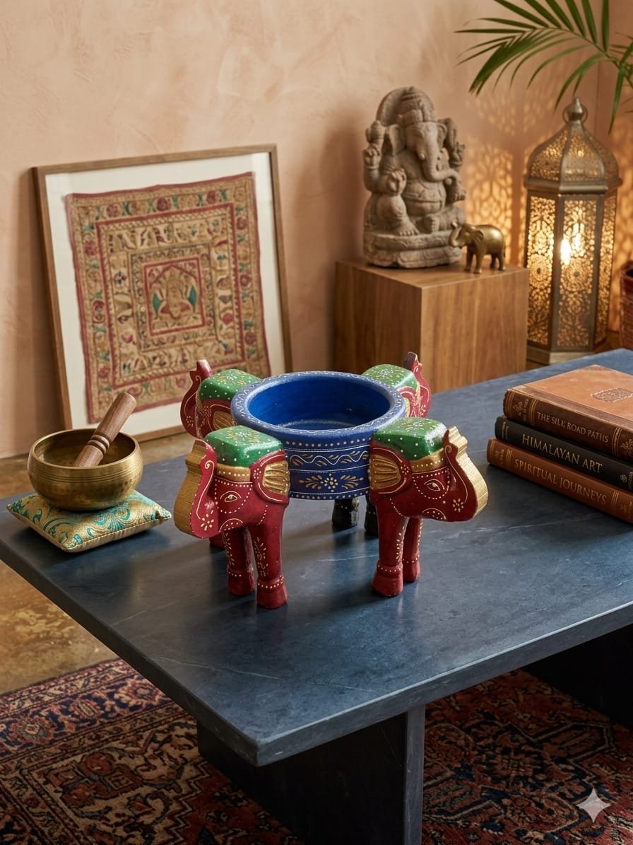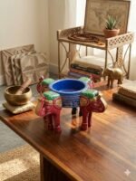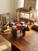 Enhance the serenity of your home with this exquisite Artisanal Elephant Diya Holder. Hand-carved and painted with meticulous detail, this piece features four majestic elephants supporting a central ceremonial bowl. It is a timeless representation of strength, wisdom, and light, making it a perfect addition to your spiritual space or home decor.