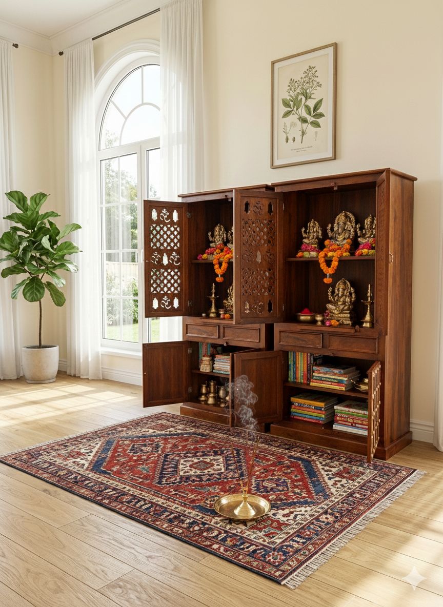 Solid wood temple, wooden mandir, handcrafted pooja mandir, Indian home temple, luxury wooden temple, prayer cabinet, Hindu mandir furniture, pooja unit with storage, premium wood mandir, traditional carved temple, home prayer furniture