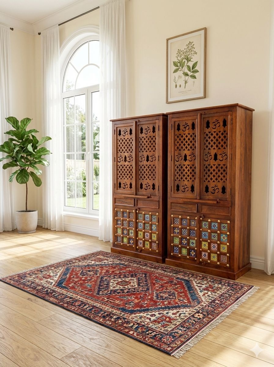 Made from high-quality seasoned solid wood, this temple is strong, durable, and built to last for generations. The spacious prayer area comfortably accommodates idols, lamps, and incense holders, while the multiple storage drawers below provide convenient space for pooja essentials. The detailed “Om” and jali-style back panel enhances spiritual ambiance and airflow.