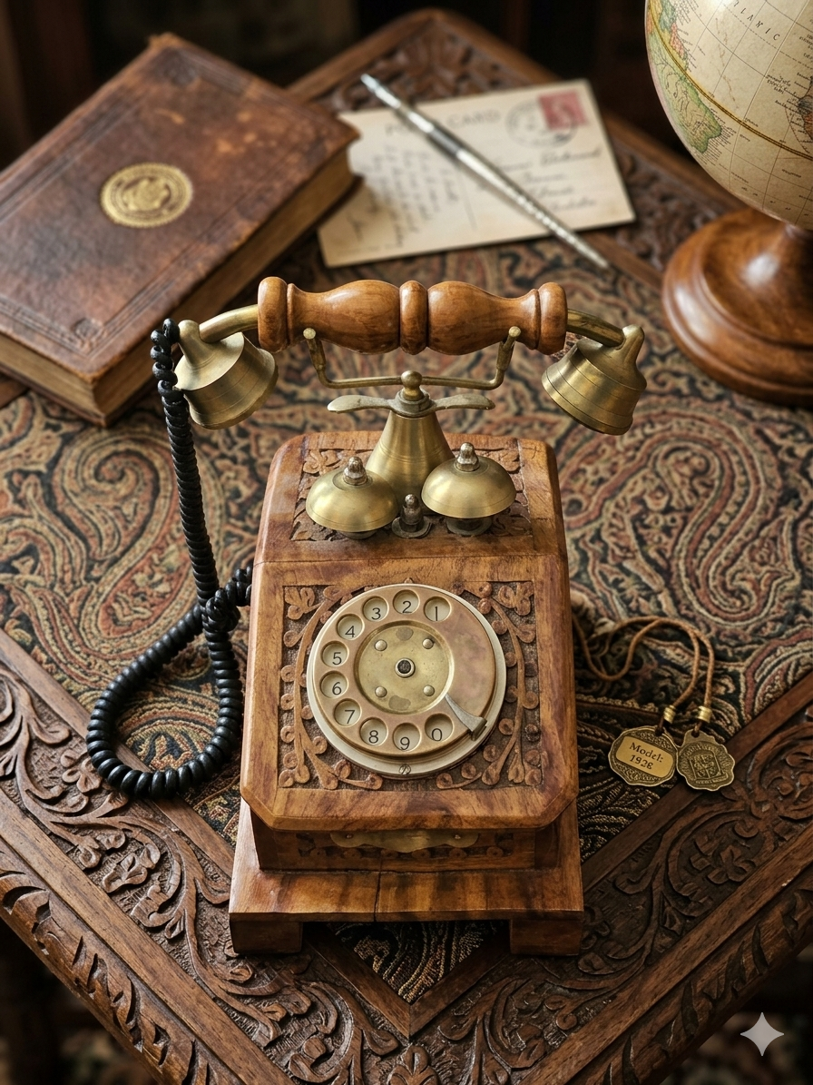Transport your living space back to an era of timeless sophistication with this stunning Handcrafted Vintage-Style Telephone. Meticulously carved from premium solid wood and accented with polished brass, this showpiece is the ultimate statement for lovers of antique aesthetics and classic craftsmanship. While it serves as a non-functional decorative idol, its intricate detailing and weighted feel bring the authentic charm of the early 20th century right to your desk or mantelpiece.