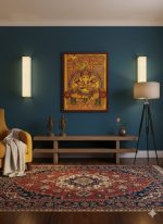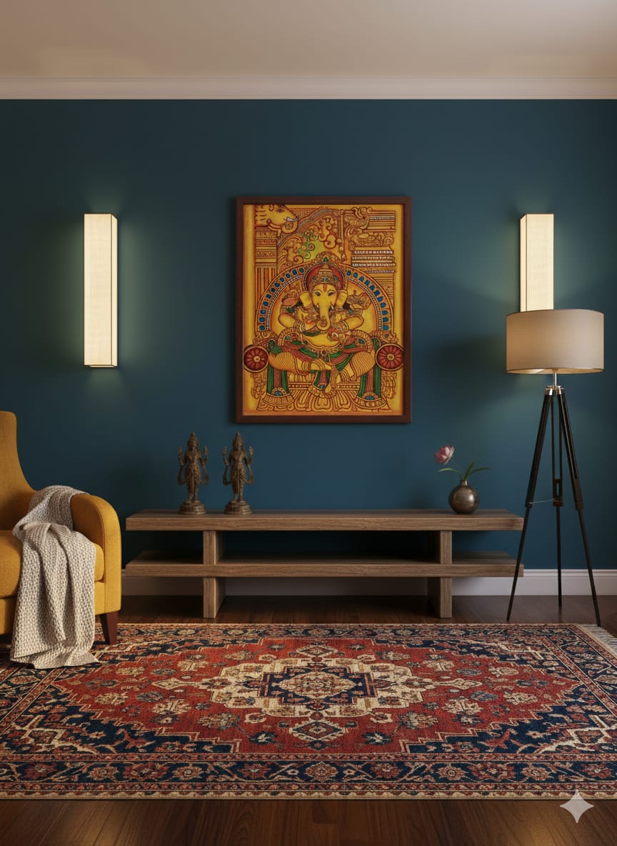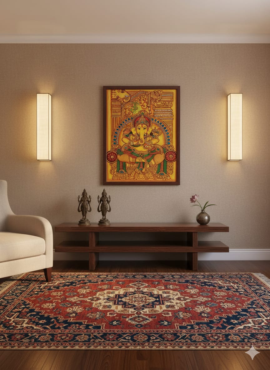 This magnificent Kerala mural painting depicts Lord Ganesha, the remover of obstacles and the symbol of wisdom, prosperity, and new beginnings. Rendered in the traditional Kerala mural style, the artwork features intricate line work, rich ornamentation, and harmonious earthy tones dominated by warm golds and greens. The seated form of Ganesha conveys calm authority and divine grace, while the detailed background motifs reflect classical temple architecture and sacred symbolism. Ideal for homes, offices, meditation spaces, and prayer rooms, this mural radiates positivity, spiritual protection, and timeless Indian artistic heritage.