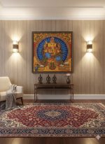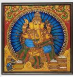 Title: The Golden Ganesha – Traditional Kerala Mural Art Embrace the energy of new beginnings with this stunning Kerala Mural depiction of Lord Ganesha. Rendered in the classic Panchavarna (five-color) tradition, this painting features the Remover of Obstacles seated majestically against a radiant blue and gold mandala.