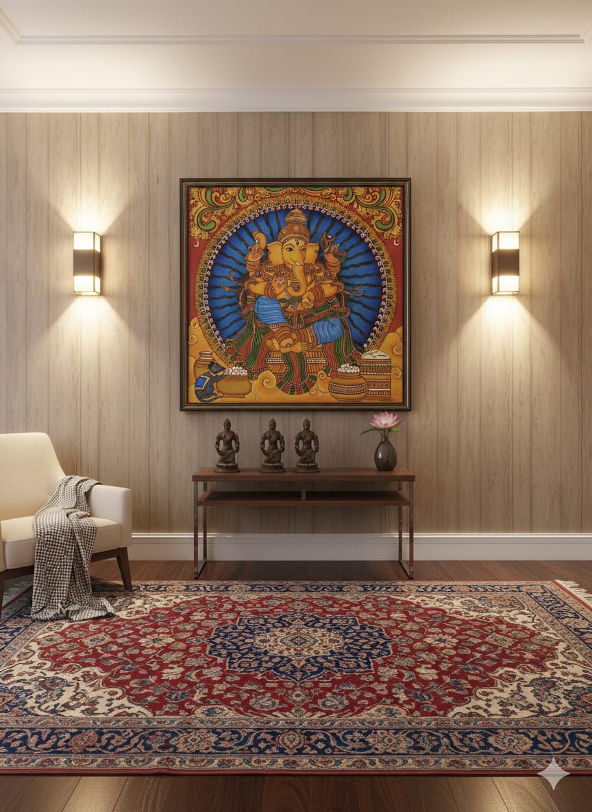 Artistic Style: Authentic Kerala Mural influence, characterized by bold outlines and intricate detailing.