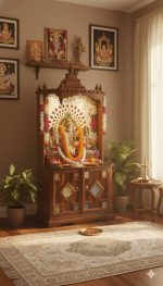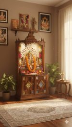 The cabinet below provides ample storage for pooja essentials like incense, oil lamps, accessories, and prayer books.