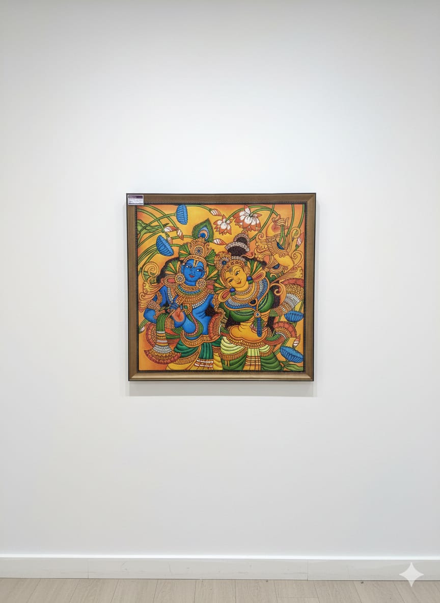 This exquisite Kerala mural painting depicts the divine union of Lord Krishna and Radha, symbolizing eternal love, harmony, and spiritual devotion. Created in the traditional Kerala mural style, the artwork is rich in intricate detailing, graceful expressions, and vibrant natural hues. The flowing forms, ornate jewelry, and lush floral elements reflect the classical aesthetic of South Indian temple art. The warm background enhances the divine presence, while the balanced composition evokes serenity and joy. Ideal for homes, prayer rooms, cultural spaces, or art collections, this mural stands as a timeless representation of Indian heritage, devotion, and artistic excellence