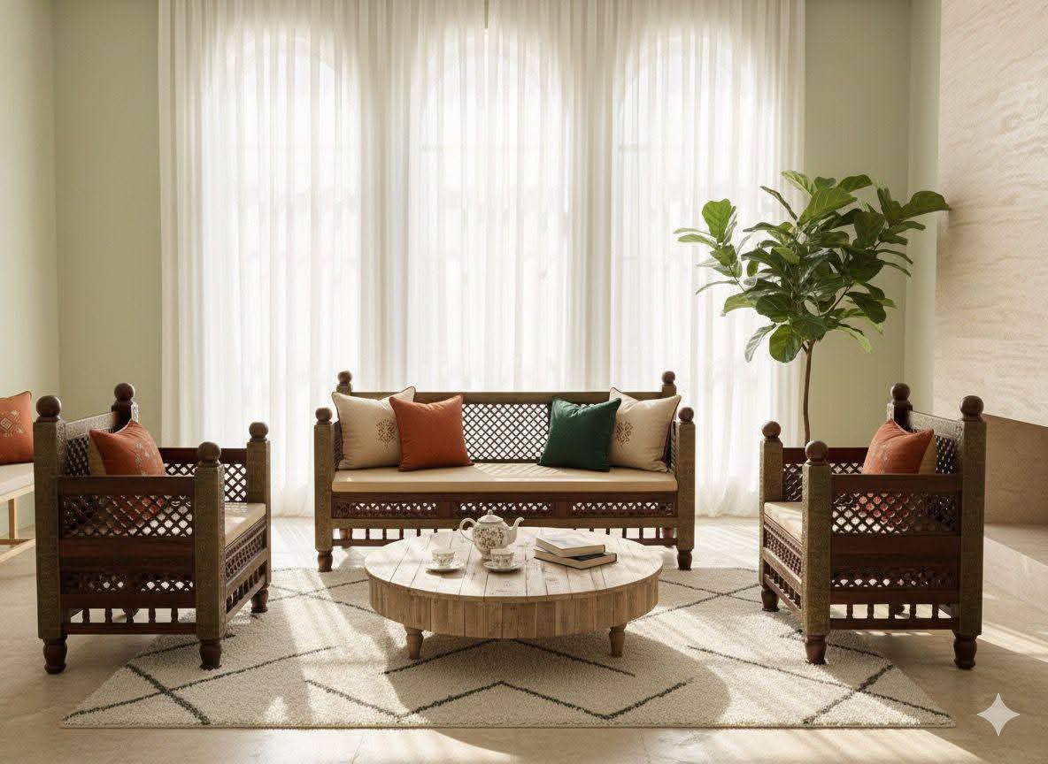 Description:Bring timeless elegance to your living room with this beautifully handcrafted Royal Sheesham Wood Sofa Set. Designed with a blend of traditional Indian artistry and modern comfort, this set features intricate lattice carvings, turned legs, and smooth finishes that showcase premium craftsmanship. The soft upholstered cushions offer superior comfort, making it perfect for both everyday relaxation and elegant gatherings.