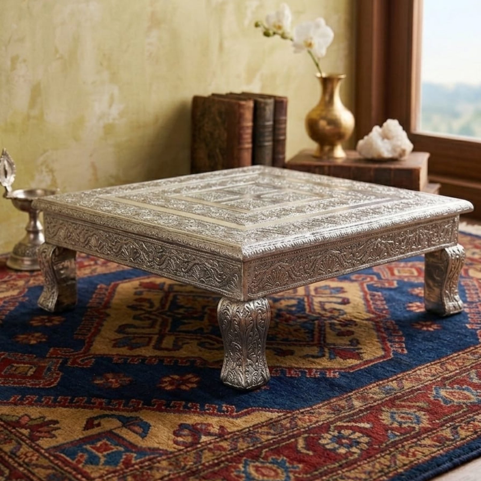 Elevate your home décor or sacred space with this exquisite Handcrafted Embossed Chowki. Meticulously designed with intricate traditional patterns, this versatile pedestal serves as a stunning focal point, blending antique charm with timeless elegance.