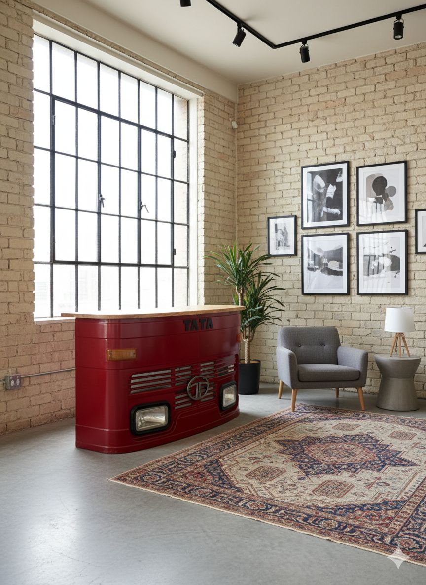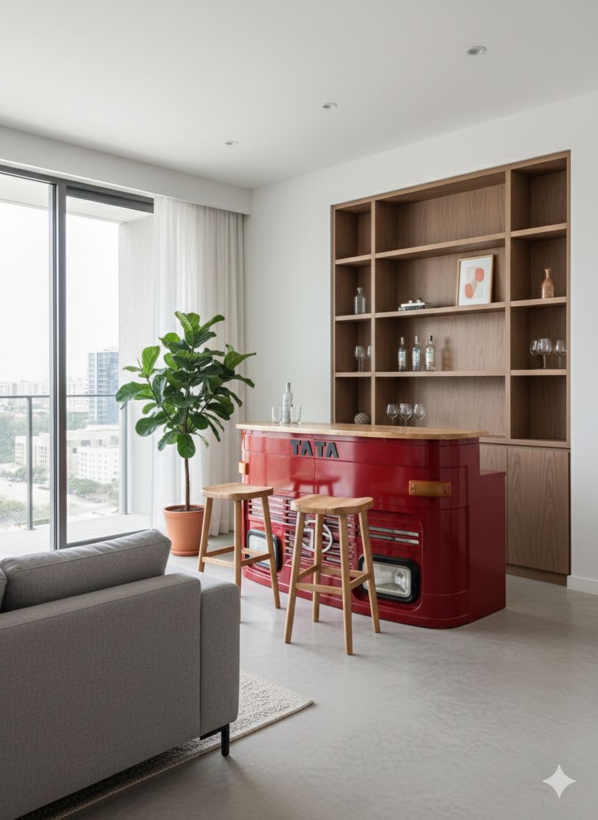 Turn your home entertaining into a conversation starter. This unique bar cabinet is meticulously crafted from the front fascia of an iconic Tata truck, finished in a vibrant automotive red. Set against a warm oak-wood countertop, it bridges the gap between rugged industrial history and contemporary luxury.