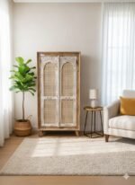 Elevate your storage with a piece that tells a story. This stunning wardrobe features a unique dual-texture design, combining natural wood grain with traditional rattan weaving. The most striking feature is the intricate, hand-carved archway framing on the doors, finished with a vintage white-wash that highlights every detail.