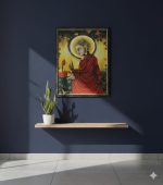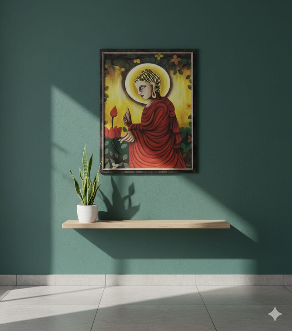 Bring a sense of profound peace to your home with this exquisite Buddha mural. Featuring a rich palette of crimson, gold, and deep forest green, this artwork depicts the Buddha in a moment of gentle contemplation, holding a lotus flower. The striking contrast between the vibrant red robes and the calming teal background makes it a perfect centerpiece for meditation rooms, living areas, or offices.