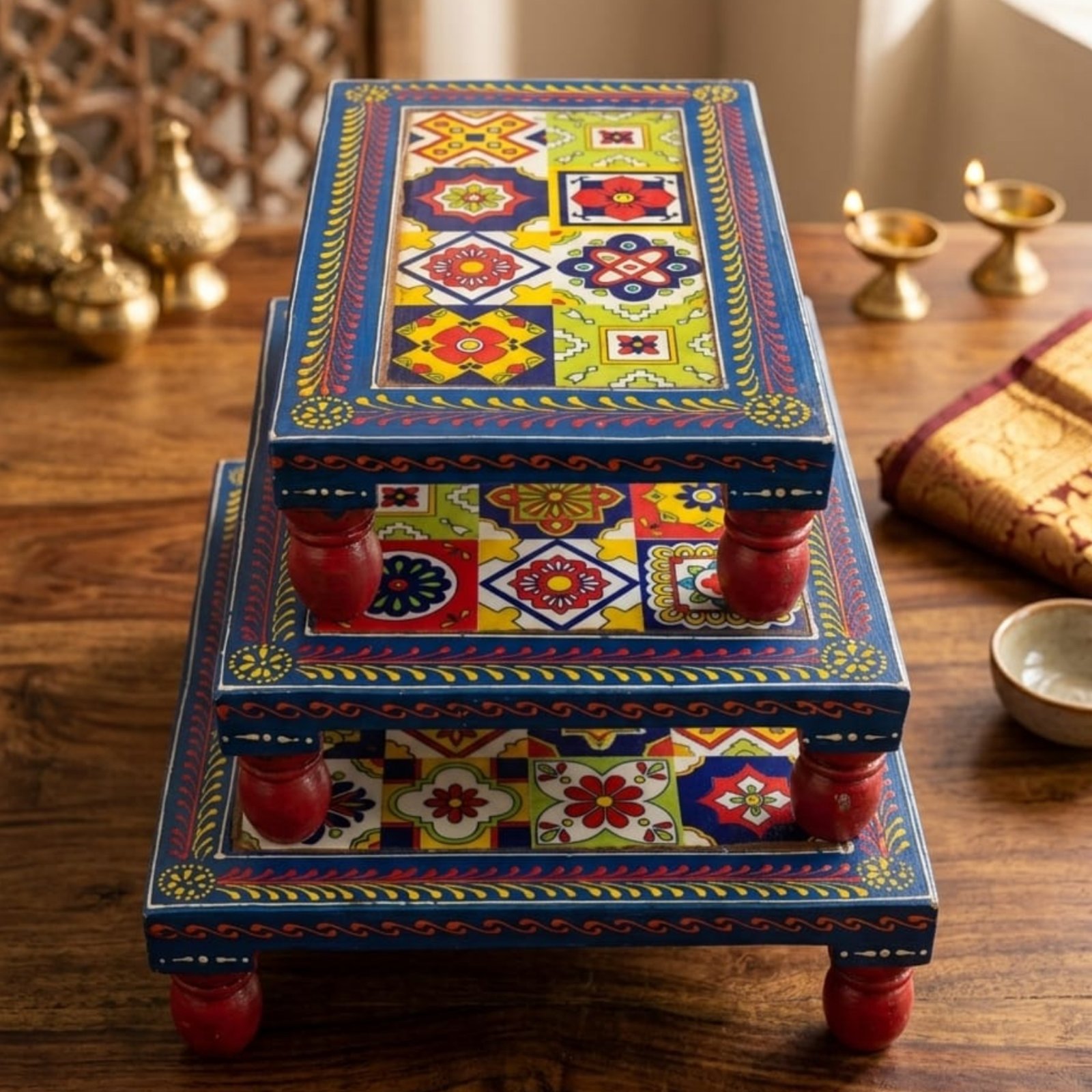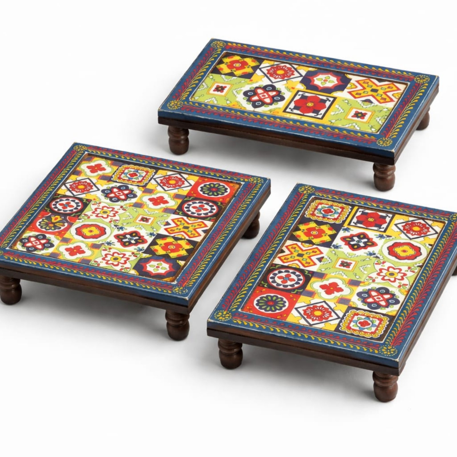 Intricate Floral Art: Each chowki showcases a beautiful grid of hand-painted floral motifs in sunny yellows, forest greens, and sky blues.