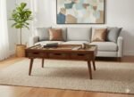 Designed for both beauty and utility, the table includes discreet functional drawers—as seen in the open view—perfect for tucking away remotes, coasters, or magazines to keep your space clutter-free. The rich, hand-rubbed finish and sturdy turned legs ensure this piece remains a durable heirloom for years to come.