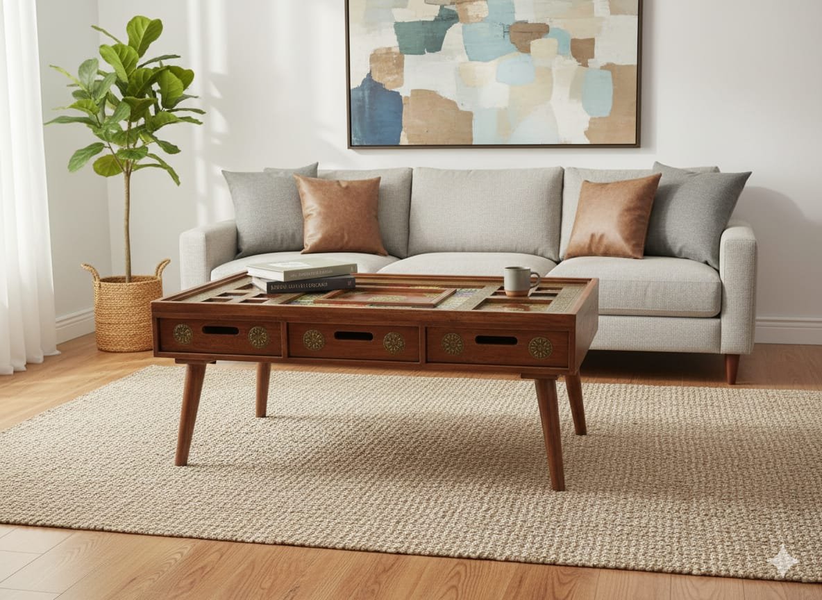 #CoffeeTableDesign #HandcraftedFurniture #SolidWoodTable #LivingRoomInspo #BrassInlay #TraditionalCraftsmanship #LuxuryHomeDecor #StatementFurniture #InteriorStyling #BohoLuxeHome #ArtisanMade #HomeCenterpiece
