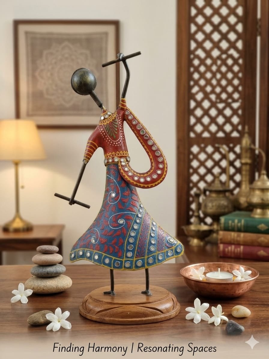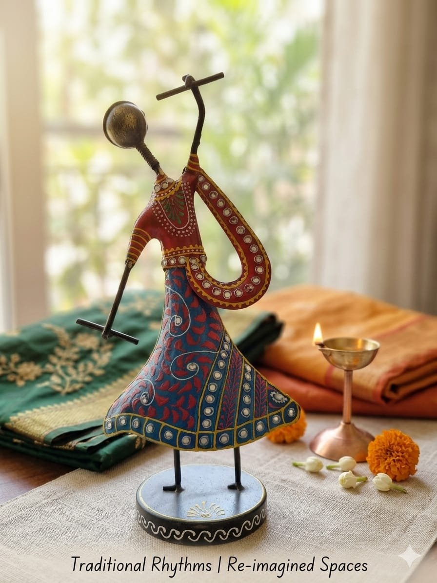 Capture the essence of India’s festive spirit with this exquisitely handcrafted metal figurine. Depicting a graceful dancer in the middle of a traditional Dandiya folk dance, this piece features intricate hand-painted patterns in rich crimson and deep azure, accented with delicate bead-work.