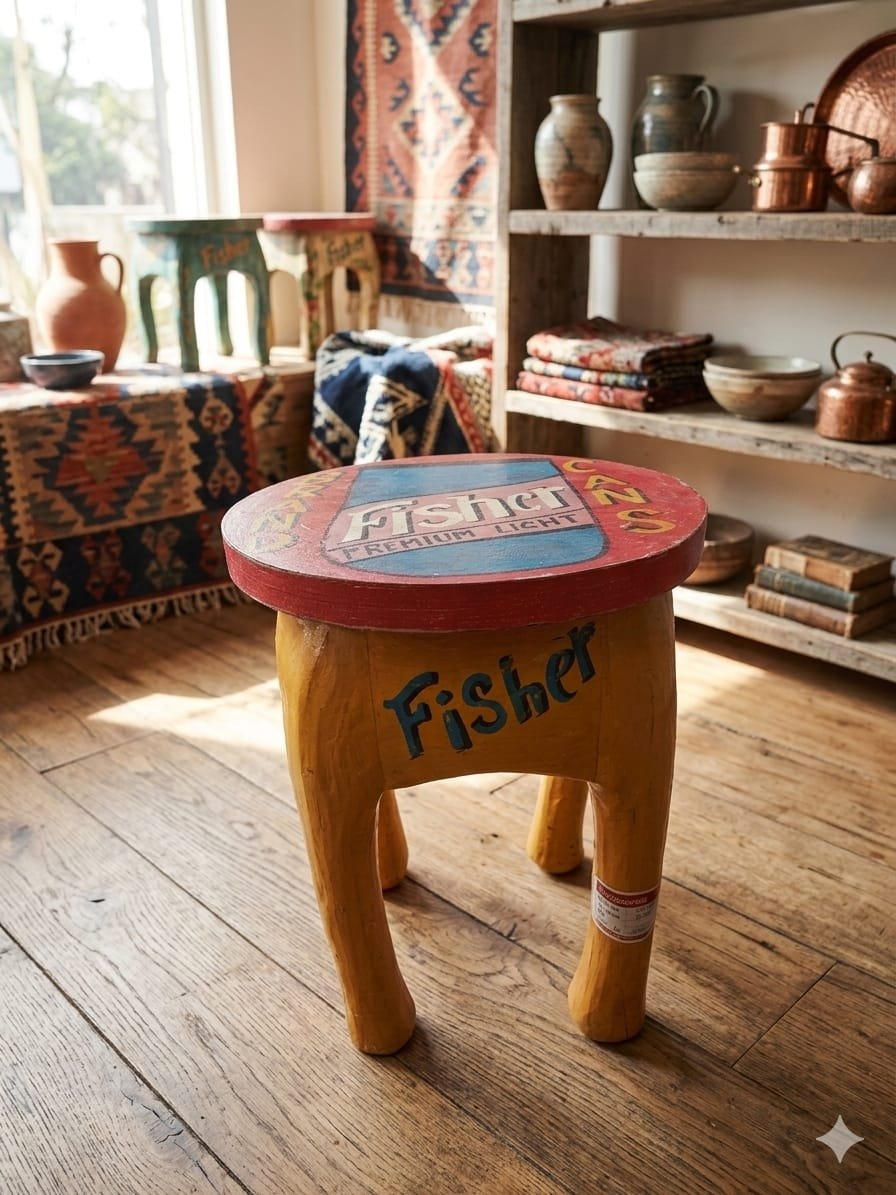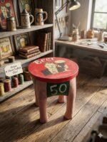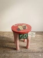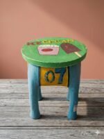 Each stool is crafted from solid wood and finished with a distressed, rustic texture that gives it a unique, “found” character. The vibrant hand-painted graphics and bold numbering make it a standout accent piece that feels both artisanal and sturdy.