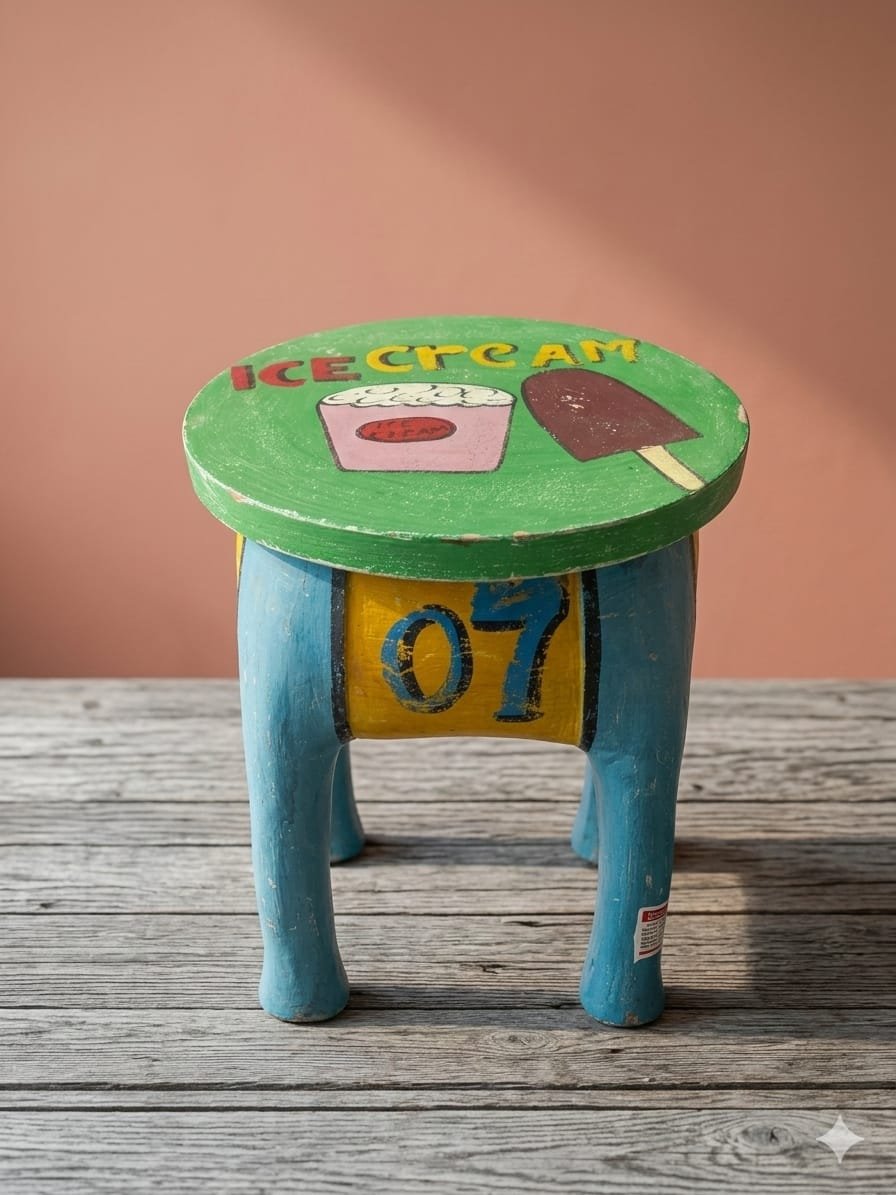 Artisanal Design: Features a cheerful green top with hand-illustrated ice cream treats and a classic “07” vintage-style numbering on the base.