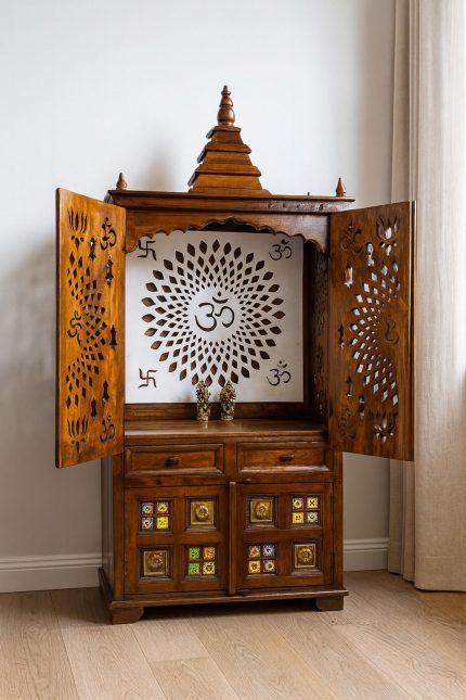 An exquisite handcrafted wooden temple showcasing intricate carvings, premium craftsmanship, and a royal finish. Designed to make a statement in villas and large prayer rooms, it embodies luxury, tradition, and divine presence.