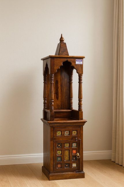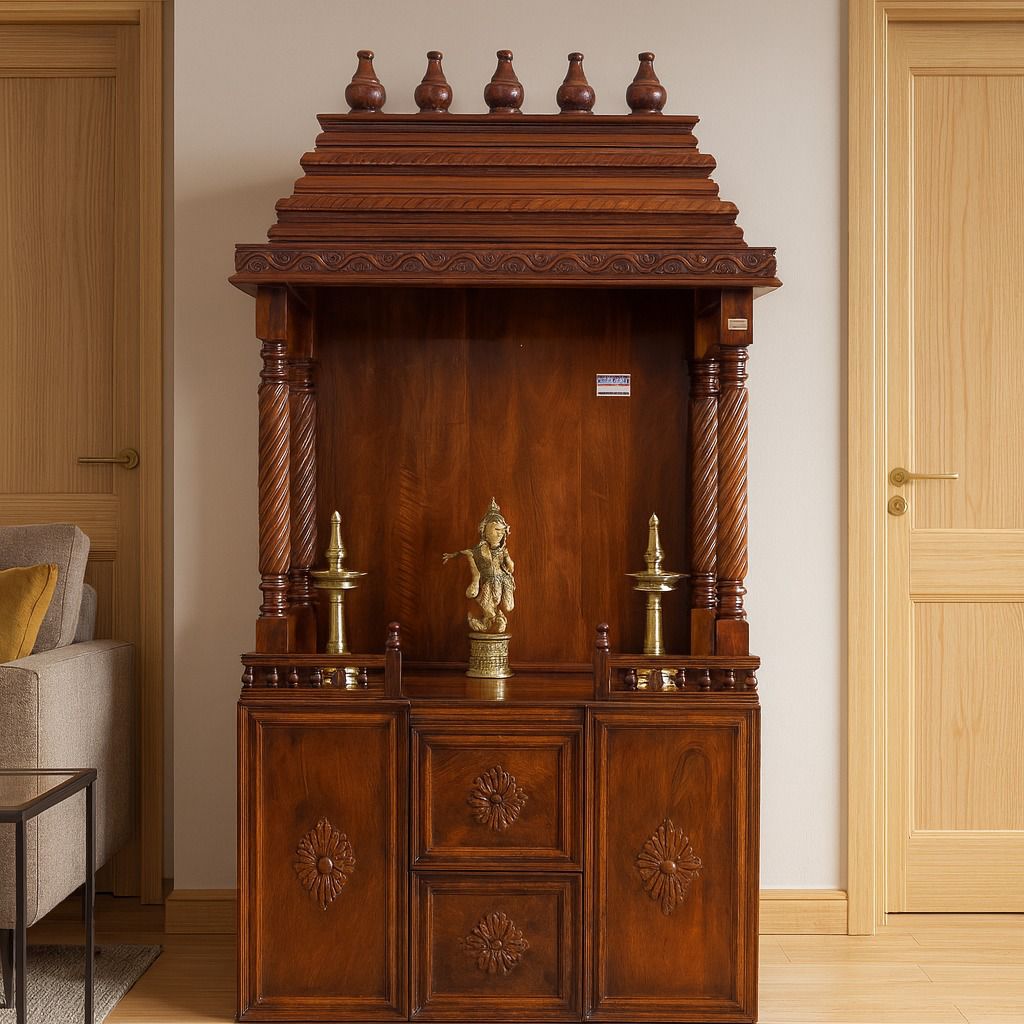 A grand handcrafted wooden temple showcasing intricate carvings and a rich, traditional finish. Perfect for villas and spacious interiors, it reflects fine craftsmanship and divine elegance.